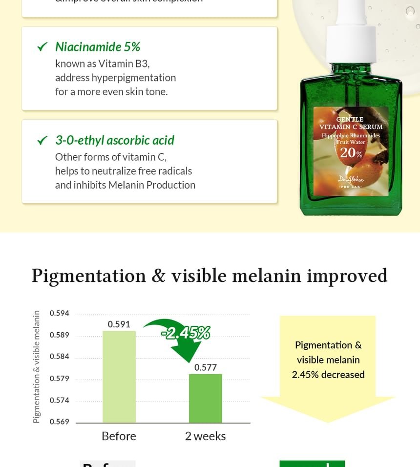- Gentle & Non-Irritating: Formulated with a stabilized Vitamin C derivative and soothing ingredients to minimize irritation, making it suitable for sensitive skin.