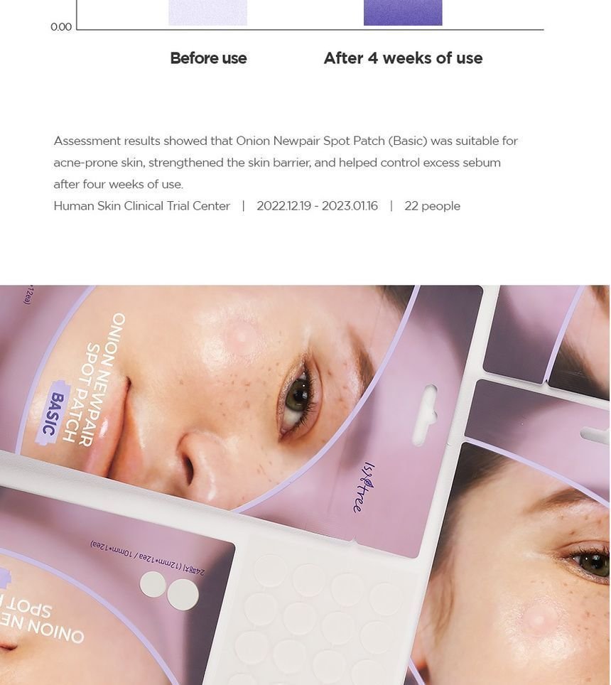 The Isntree Onion Newpair Spot Patch Basic offers a multitude of benefits for acne-prone and sensitive skin. These patches create a moist healing environment, crucial for faster recovery. They effectively absorb pus and oil from blemishes, reducing inflammation and preventing picking – a habit that can lead to scarring. The ultra-thin design ensures the patches are virtually invisible, allowing you to wear them comfortably under makeup. Unlike some spot treatments that can be drying, these patches help maintain skin hydration, minimizing discomfort and promoting a smoother complexion. They are particularly effective on whiteheads, pimples, and even post-acne marks, helping to fade them over time. The patches also act as a physical barrier, protecting the blemish from external irritants and bacteria, further preventing infection and promoting quicker healing.