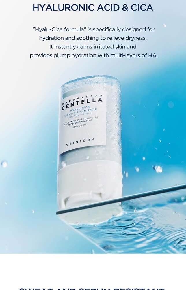 The SKIN 1004 – Madagascar Centella Hyalu-Cica Silky-Fit Sun Stick is powered by a carefully curated blend of skin-loving ingredients: